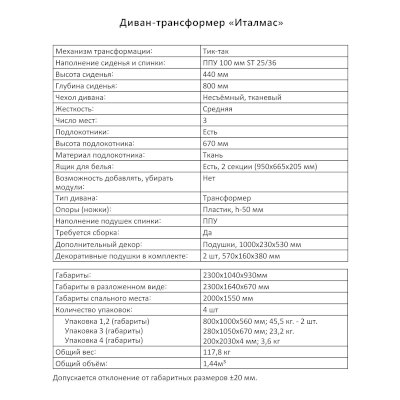 Диван-трансформер Италмас (Аквилон) продается в интернет-магазине v-tule-mebel.ru по цене 73 376 руб. Есть доставка по Туле и Тульской области. Возможность подъема на этаж и сборки уточняйте у менеджера по телефону 8(800)505-27-11.